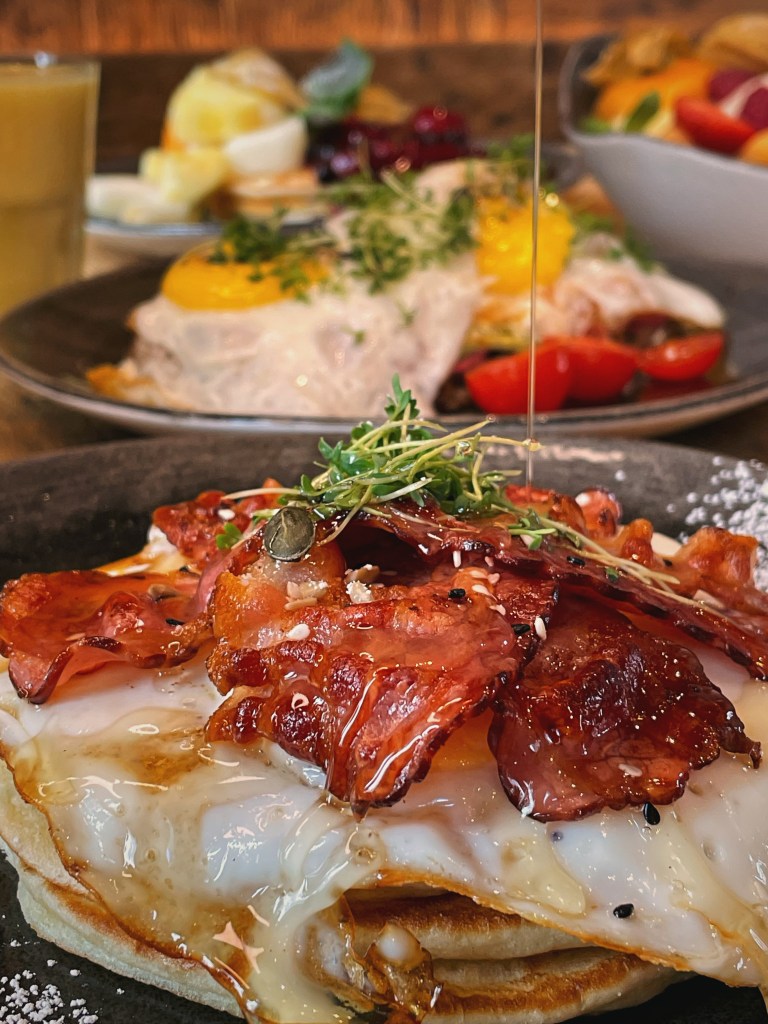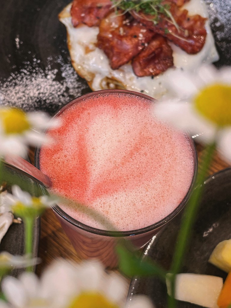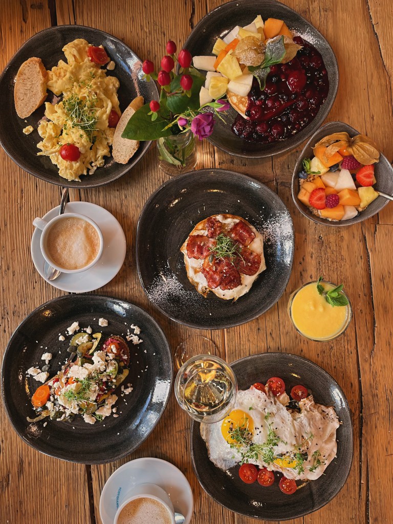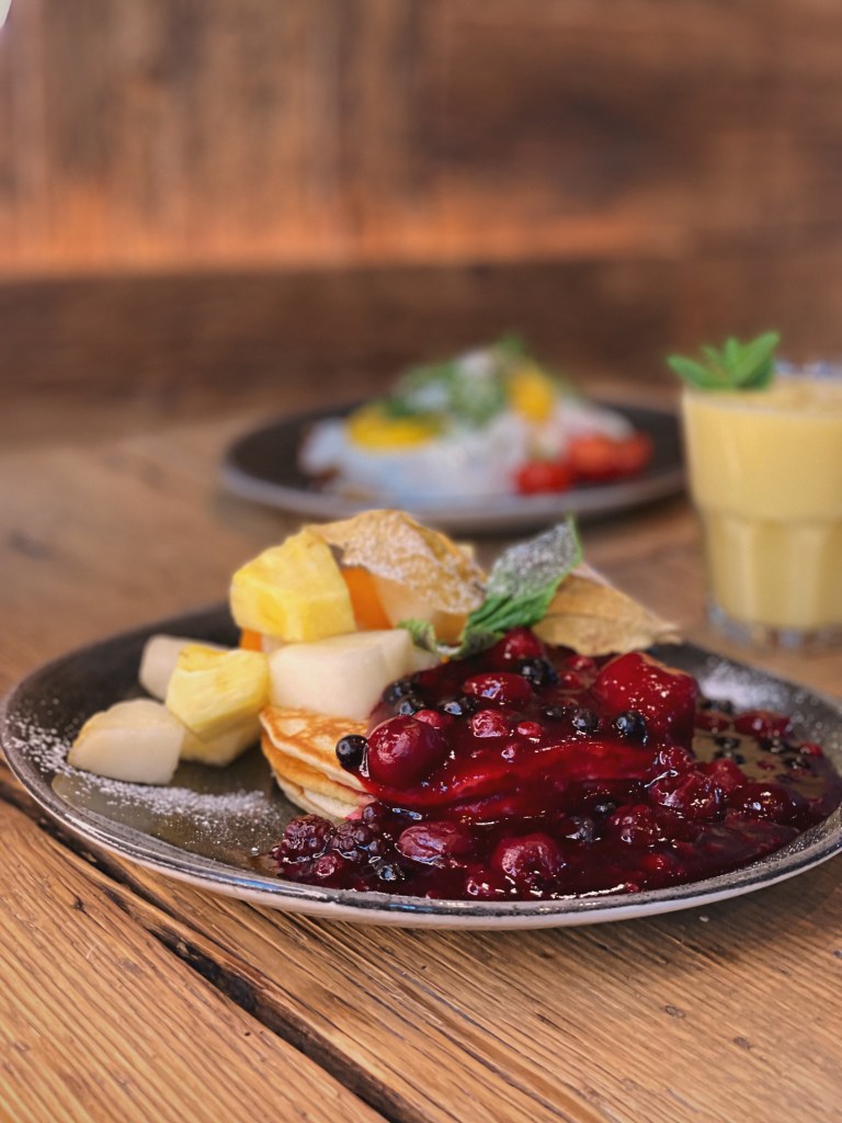 Die Frühstücksreise bei Cotidiano begann für uns mit dem „HUMMUSBROT“. Hier trifft ökologisches Finnlandbrot auf hausgemachten Rote-Bete-Hummus, dazu gesellen sich gegrilltes Gemüse und wahlweise Hirtenkäse – übrigens auch in einer veganen Variante erhältlich. Der „PANCAKE TOWER SWEET N‘ SALTY“ war ein wahrer Genuss für die Sinne. Amerikanische Pancakes, gekrönt von einem Spiegelei aus Bio-Eiern, knusprigem Bacon und süßem Agavendicksaft – eine meisterliche Kombination aus salzig und süß. Für alle Superfood-Liebhaber empfehlen wir den „Pink Latte“. Dieser Superfood Latte mit Goji und Acai verspricht eine Extraportion Energie. Das „AVOCADO-TOAST DELUXE“ ist der Klassiker in einer aufregenden Neuinterpretation. Frische Avocado und Räucherlachs treffen auf zwei Bio-Spiegeleier, cremigen Hirtenkäse, hausgemachten Rote-Bete-Hummus und Cocktailtomaten, serviert auf ökologischem Dinkel-Vollkornbrot mit einem erfrischenden Zitronendressing. Und wer lieber etwas Fruchtiges zum Brunch bevorzugt, wird von den „FRUITY“ Pancakes begeistert sein. Diese amerikanischen Leckerbissen werden mit einem warmen Beerenkompott, frischem Obstsalat und Physalis serviert. Freunde des Herzhaften dürfen das „TOMATE-HIRTENKÄSE“ nicht verpassen. Hier treffen fluffiges Rührei aus Bio-Eiern auf cremigen Hirtenkäse und saftige Cocktailtomaten. Um die Geschmackserlebnisse perfekt abzurunden, probierten wir die erfrischende „Ginger Mint Limonade“ und den belebenden „Green Yuzu Holunder Eistee“, ein grüner Tee mit japanischer Zitrone.