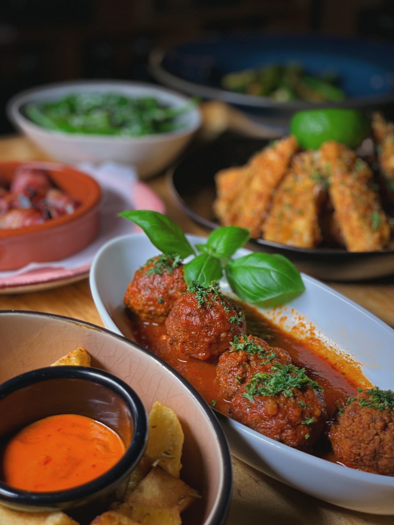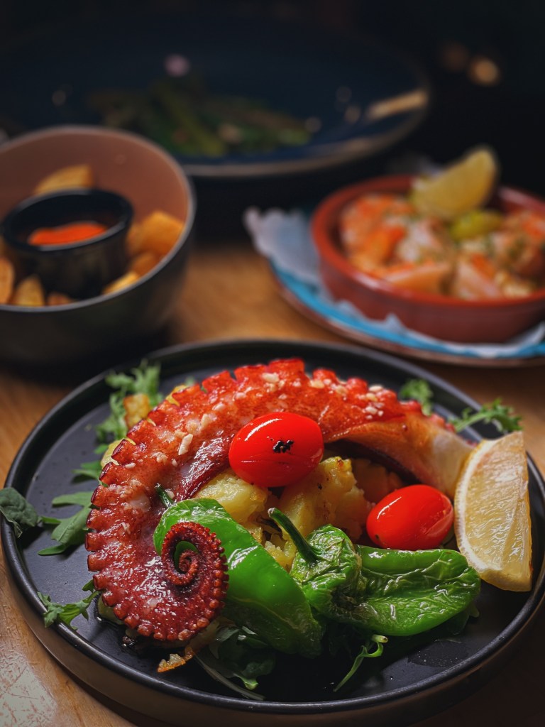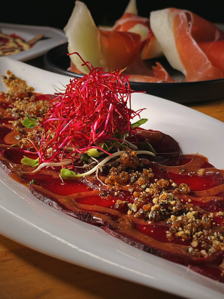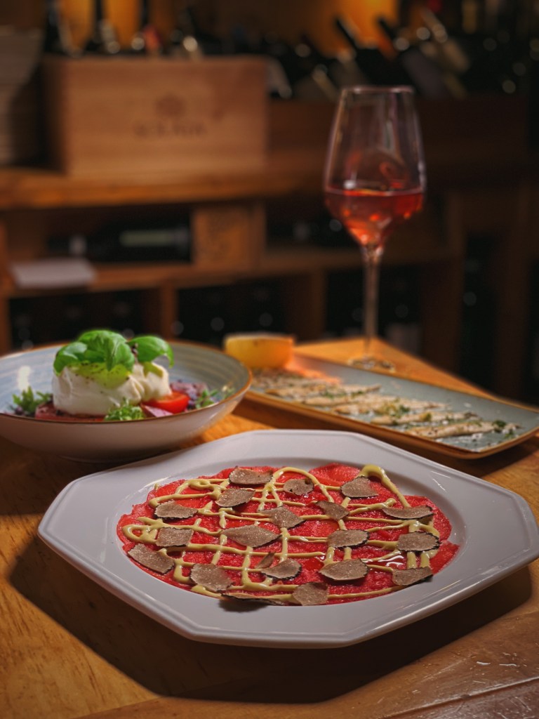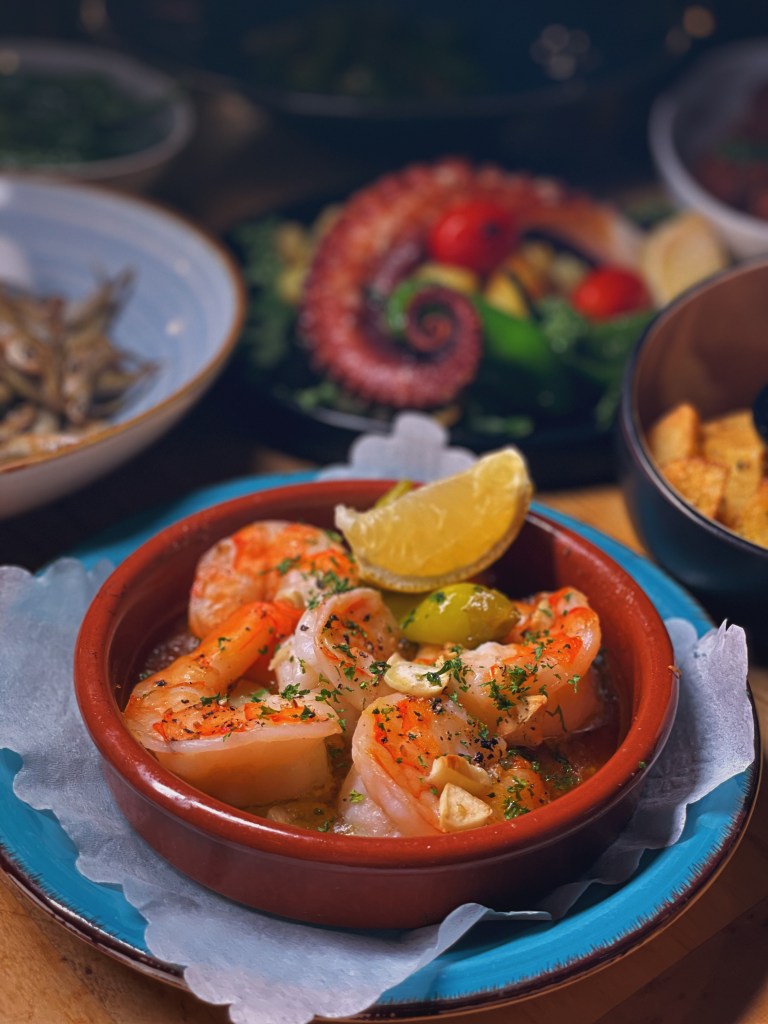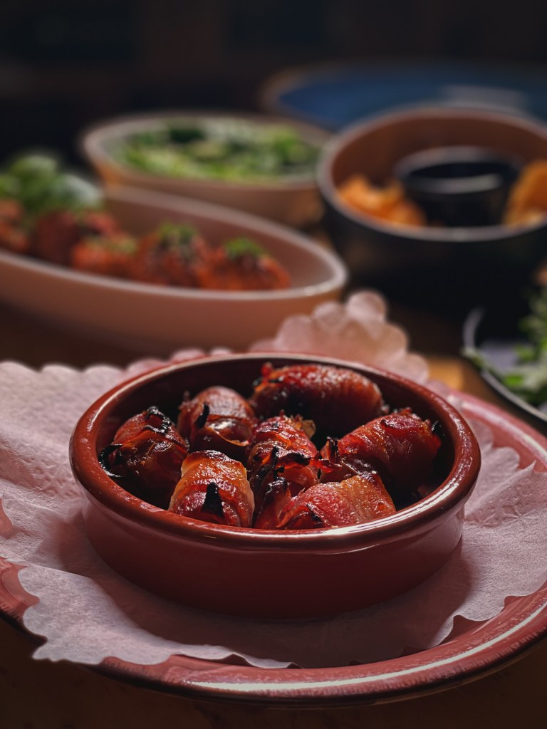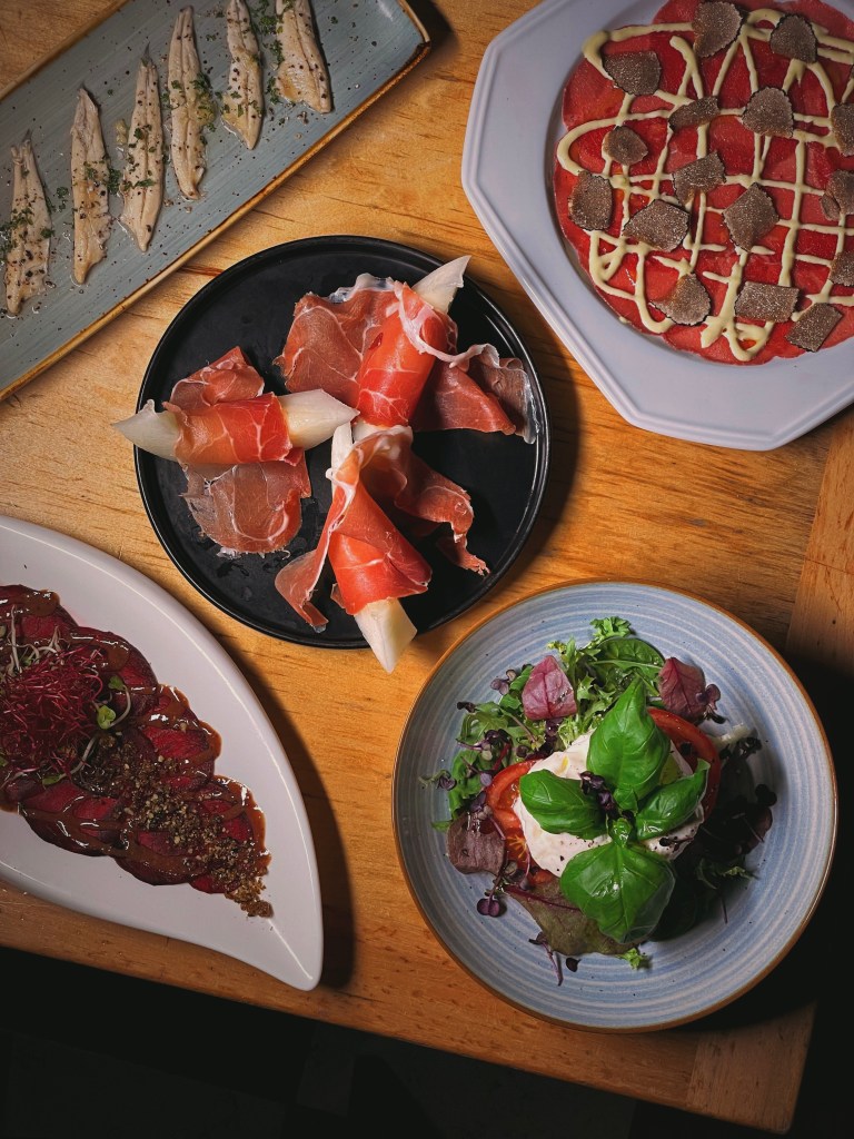 Um unsere kulinarische Reise gebührend zu starten, haben wir uns zunächst mit erfrischenden Cocktails verwöhnt: Der Espresso Martini, Lillet Wildberry und Limoncello Spritz. Unsere kulinarische Reise begann mit den kalten Tapas. Das Rote-Bete-Carpaccio mit Kürbiskernkrokant erwies sich als wahre Gaumenfreude. Ebenso beeindruckend war das getrüffelte Rindercarpaccio, das uns an die berühmten Kreationen von Cipriani erinnerte. Die Boquerones en Vinagre (das sind eingelegte Sardellenfilets) sorgten für eine angenehme Abwechslung und die Burrata auf Blattsalat sowie der Serrano-Schinken auf süßer Melone rundeten das Ganze perfekt ab. Dann wurde es Zeit für die warmen Tapas. Die knusprigen Datteln im Speckmantel waren ein wahrer Hochgenuss, und der gegrillte Oktopusarm entführte uns geschmacklich ans Mittelmeer. Die frittierte Aubergine mit Honig und die köstlichen Fleischbällchen in Tomatensauce überraschten uns sehr. Doch die absoluten Stars des Abends waren die Gambas in Olivenöl mit Knoblauch! Zum krönenden Abschluss gönnten wir uns eine kleine süße Sünde. Ein warmes Schokoladentörtchen, das förmlich auf der Zunge zerging, gebratenes Eis, knusprige Churros mit verführerischer Schokosauce und weitere Leckereien rundeten unser Festmahl perfekt ab.