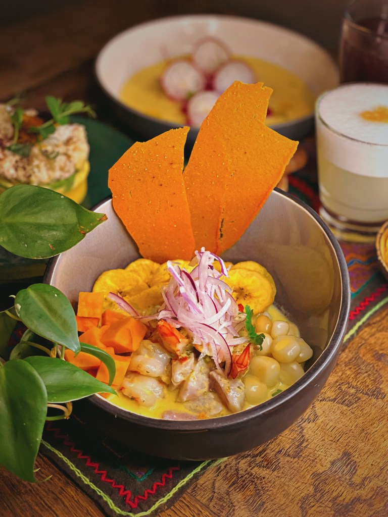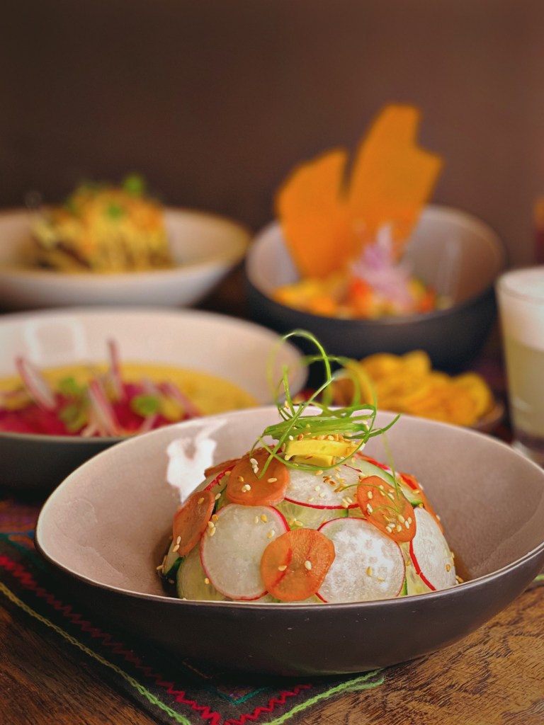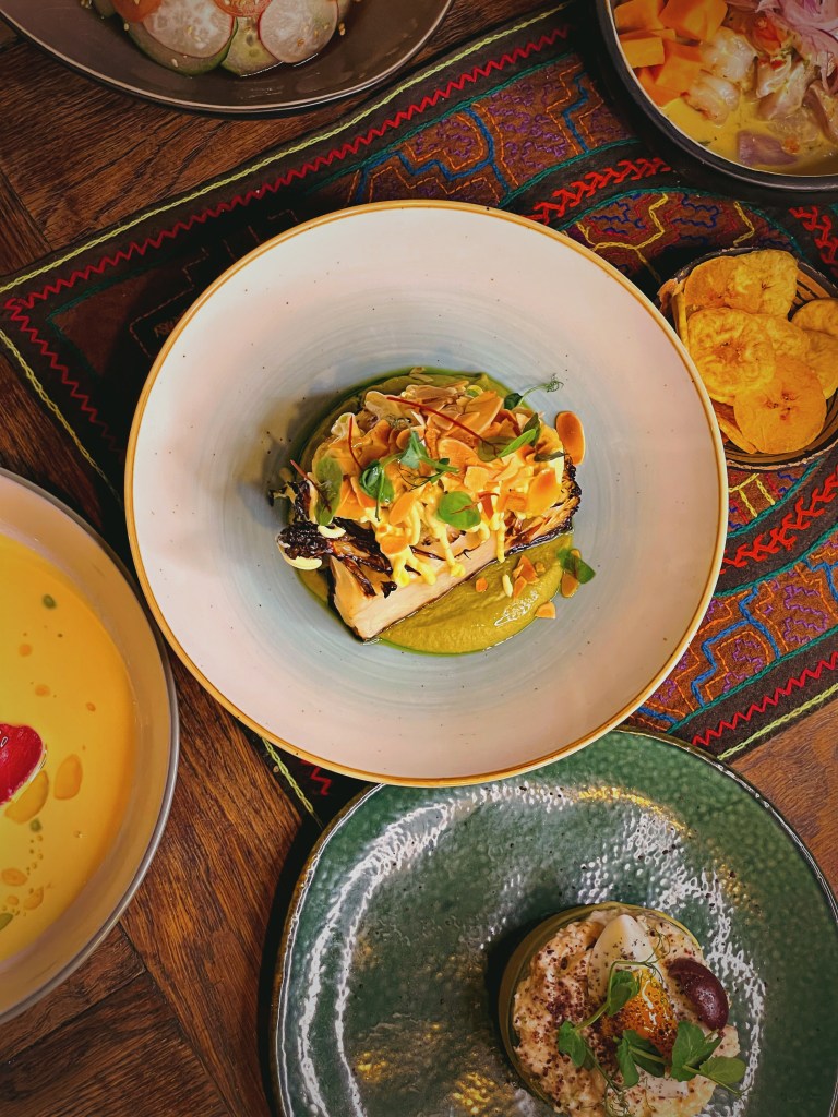 Unsere kulinarische Reise begann mit erfrischenden Pisco- und Maracuja Sours, gefolgt von einem wahrhaft außergewöhnlichen Menü. Der Tiradito Charapa, zubereitet mit Kabeljau, Roter Beete, Kokos-Leche de Tigre, Chili und Avocado, war ein geschmacklicher Höhepunkt. Die Ceviche Mixto Verde Andino, bestehend aus Loup de Mer, Gambas, Chili Limo, Limette, Tigermilch aus Koriander und Schafskäse, dazu Süßkartoffeln und Chifles, verzauberte uns. Es gab außerdem eine vegane Variante: Ceviche Nikkei mit Pilzen, Soja, Sesamöl, Chili-Rocoto, Avocado, Ingwer, Gurke und Zwiebeln. Eine Fusion von japanischen und peruanischen Einflüssen. Der Pulpo Parrillero, würziger Tintenfisch mit Chorizo-Pulver, Anticucho Sauce, Huanca-verde und Trüffelkartoffeln, brachte uns die Aromen Perus näher. Das Chicharrón Chalaco, zart gebratener Schweinebauch mit Süßkartoffeln und einer einzigartigen Salsa Chalaquita aus Tomaten, Zwiebeln, Koriander, Aj Amarillo und Limette, war ein weiteres Meisterwerk auf unserem Teller und definitiv unser Highlight des Abends. Zum krönenden Abschluss wurden wir mit einem Dessert de la Casa verwöhnt, bestehend aus einem Flan und einer Schokoladenmousse, begleitet von erfrischendem Chicha Morada, einem Getränk aus lila Mais.