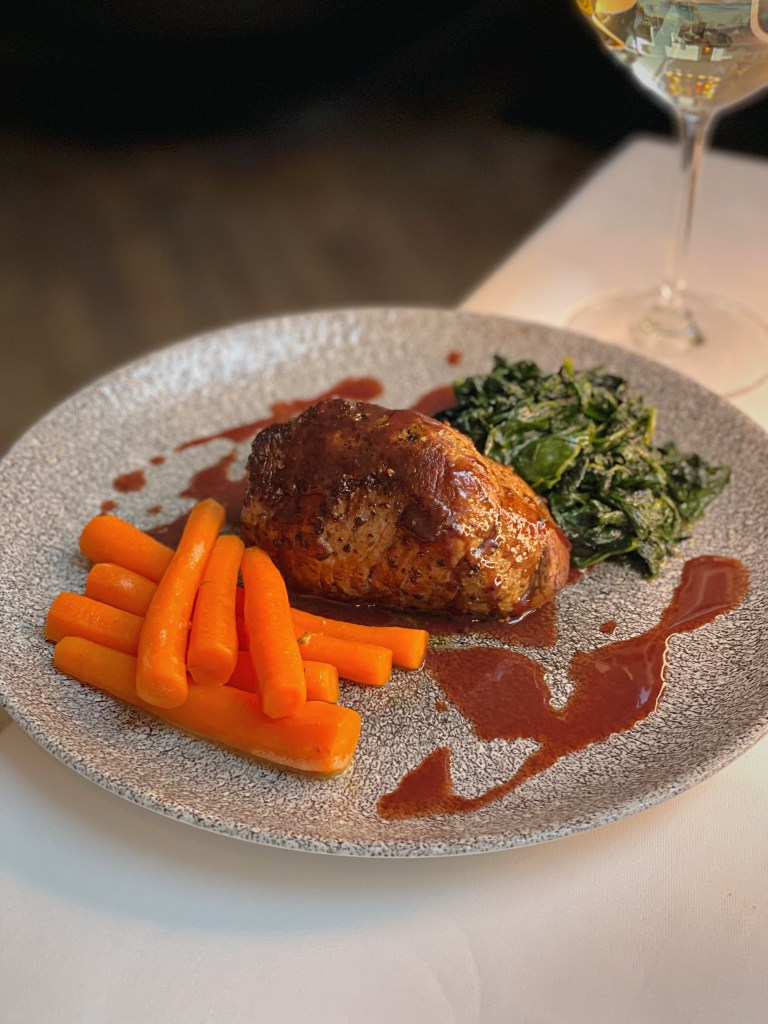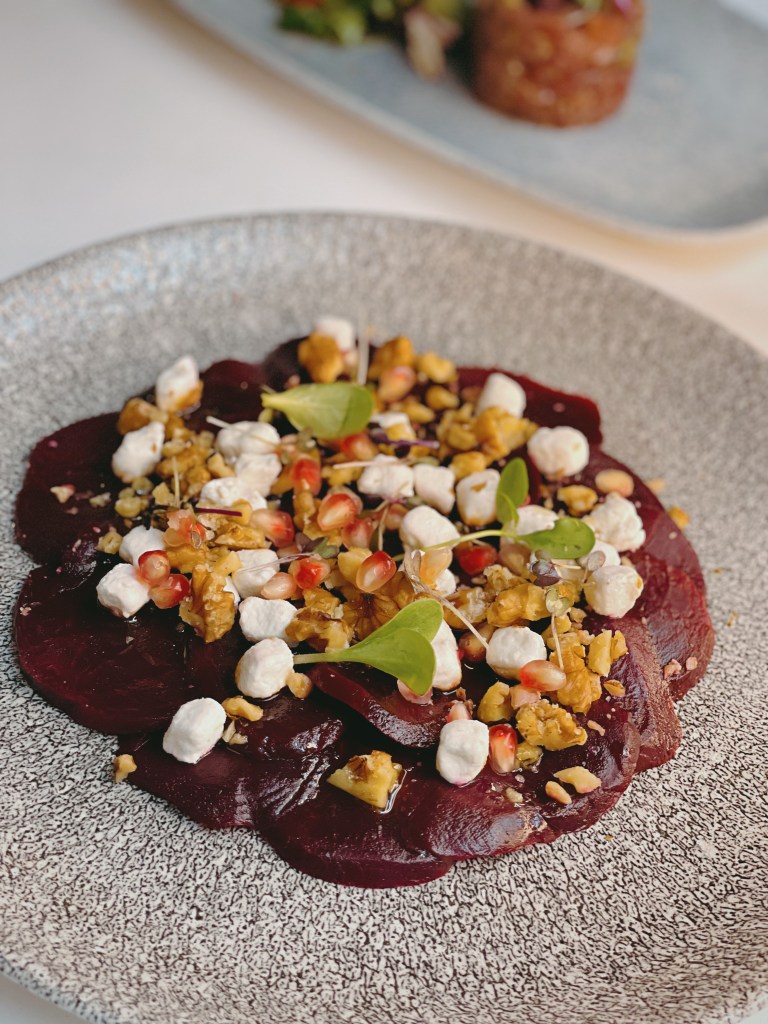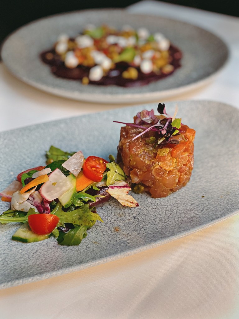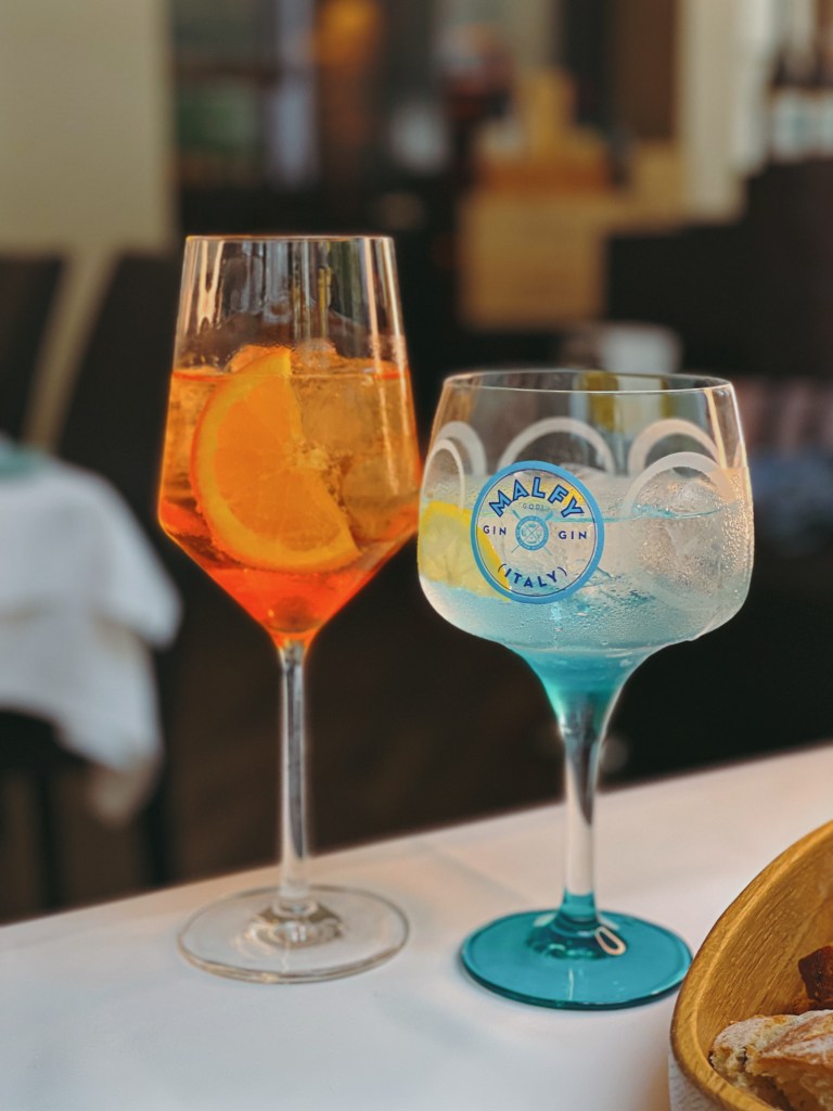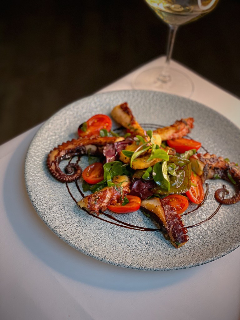Gleich zu Beginn wurden wir mit einem herzlichen Gruß aus der Küche verwöhnt – knusprige Bällchen, gefüllt mit sonnengereiften Tomaten, cremigem Mozzarella und verlockendem Quattro Formaggi. Diese kleinen Köstlichkeiten wurden begleitet von einem erfrischenden Gin Tonic und einem spritzigen Aperol Spritz, die unsere Gaumen auf das vorbereiteten, was noch kommen sollte. Dann kamen auch schon die Vorspeisen. Das „Carpaccio di Barbabietola con Formaggio Caprino e Noci“ begeisterte mit hauchdünn geschnittenem Rote-Bete-Carpaccio, Ziegenkäse und knusprigen Walnüssen. Ebenso verlockend war die „Tartara di Tonno Mediterraneo con Capperi di Pantelleria“ – ein delikates Tatar vom Mittelmeer Thunfisch, verfeinert mit frischen Pantelleria-Kapern und erstklassigem Olivenöl. Der Zwischengang, „Tagliolini al Tartufo di Stagione nella Cialda di Parmigiano“, brachte frische Tagliolini in einer knusprigen Parmesanwaffel auf den Teller. Dieses Gericht war eine wahre Geschmacksexplosion, dank der köstlichen Almbutter und des saisonalen Trüffels. Unsere Hauptgänge, „Polpo alla Griglia su Valeriana e Datterini“ (gegrillter Oktopus, Feldsalat und sizilianische Datteltomaten) und „Filetto di Fassona con Spinaci, Carotine e Riduzione di Barolo“ (Filet vom piemontesischen Fassona-Rind, Spinat, Karotten und Barolo-Reduktion), waren Meisterwerke der italienischen Küche. Zum krönenden Abschluss wurde uns das Dessert serviert. „Cremoso al Mascarpone con Gelato al Caramello Salato e Caffè Espresso“ verband geschickt Mascarponecreme, cremig-salziges Karamell-Eis und kräftigen Espresso zu einem süßen Finale. Das zweite Dessert, „Sorbetto alla Menta Fresca Siciliana“, glänzte mit sizilianischem Minz-Sorbet und einem Hauch kaltgepressten Olivenöls.