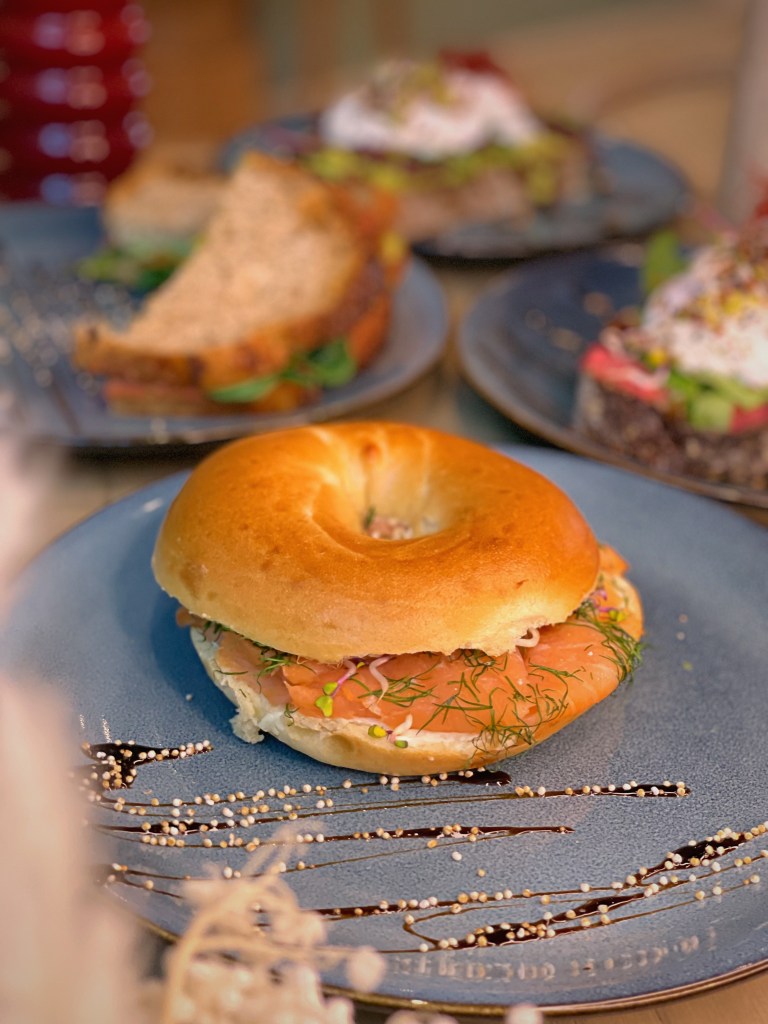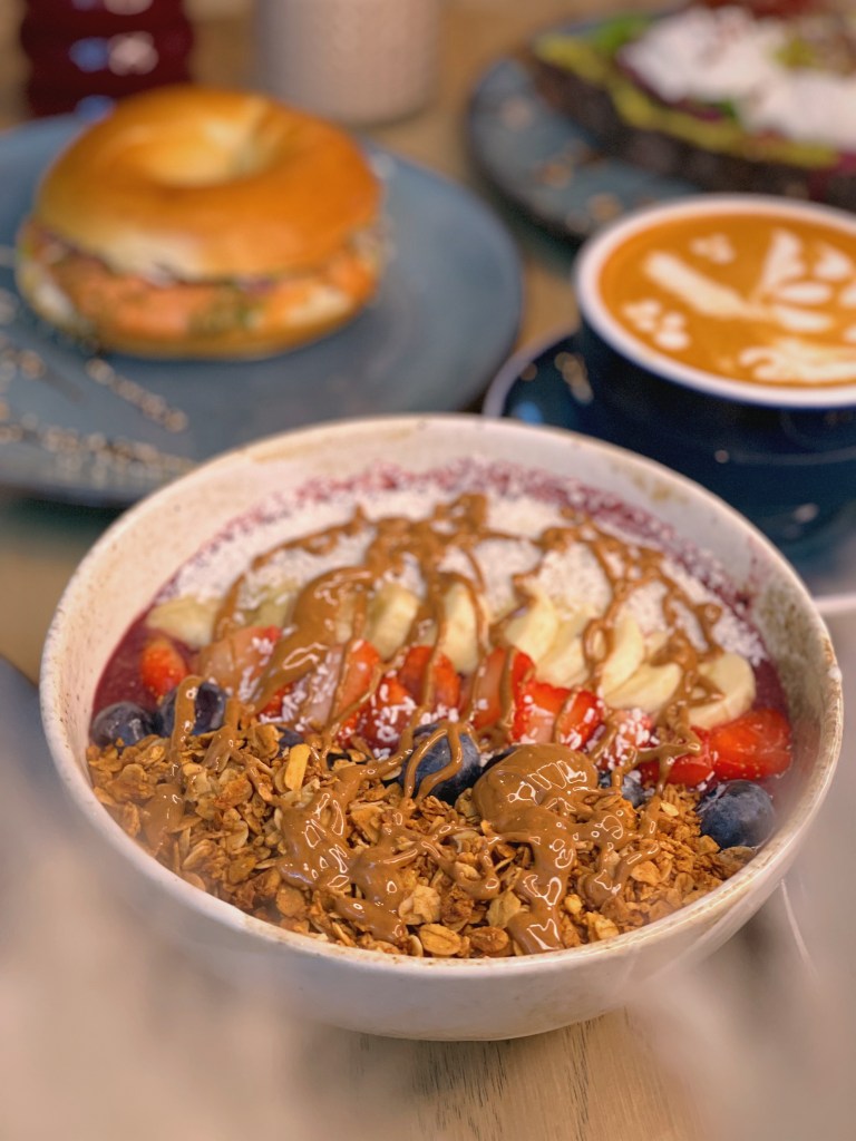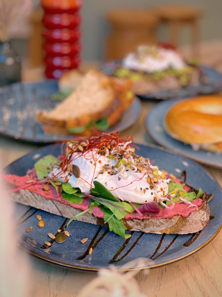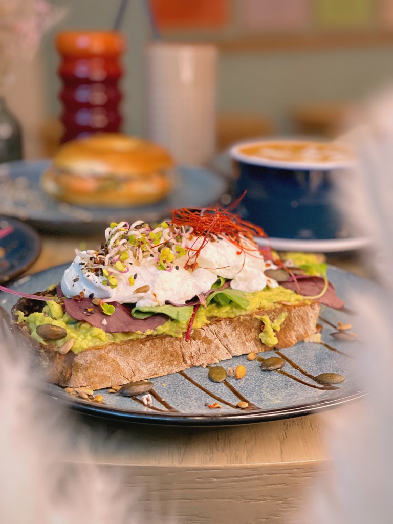 Wir betraten das gemütliche Ambiente und wurden von einer reichhaltigen Auswahl an frischen, gesunden Speisen. Wir starteten mit einer Avocado-Stulle, die von einem pochierten Ei, hausgemachter Avocado-Kräutercreme und Babyspinat gekrönt wurde. Ebenso verlockend war die Rote-Beete-Stulle, mit pochiertem Ei, hausgemachtem Rote-Beete-Hummus und Babyspinat. Die Brote waren unglaublich frisch! Natürlich mussten wir auch die Acai-Bowl (vegan) probieren – ein wahrer Traum aus Acai, Bananen, Beeren, und Datteln, garniert mit Toppings wie Bananen, verschiedenen Beeren, Granola, Kokosflocken und Mandelmus. Die Auswahl setzte sich fort mit einem köstlichen Creamcheese-Lachs Bagel und einem veganen Süßkartoffel-Edamame-Sandwich. Das absolute Highlight war die wunderschöne Latte Art auf unserem Cappuccino und die frisch gepressten Säfte.