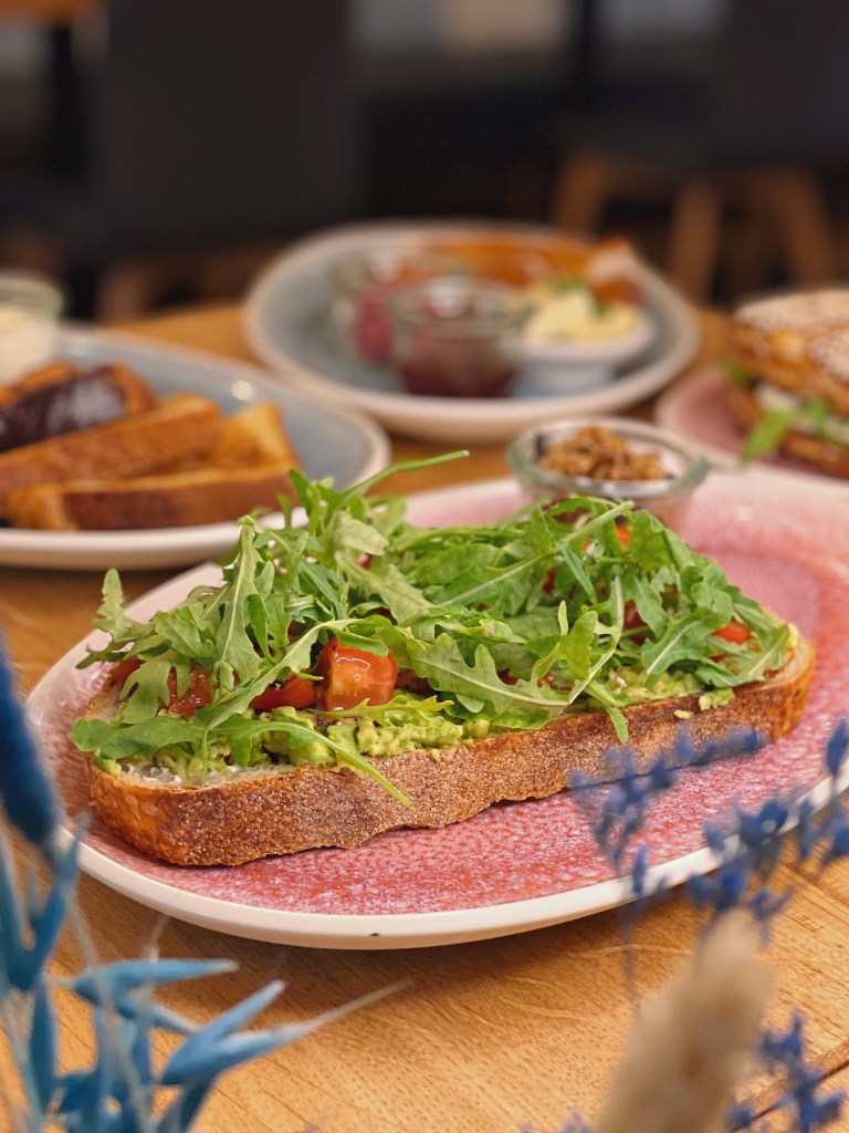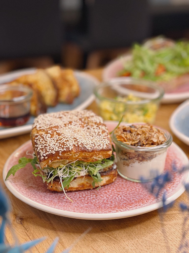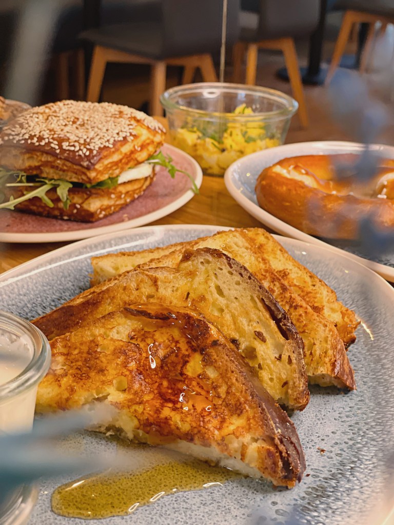 Wir begannen unseren Tag mit dem Elbkind Frühstücksburger, der auf einem Laugenpolster mit einem hausgemachten Bio-Ei-Speck-Patty, Avocadostampf, cremiger Mayo, frischem Rucola und knackigen Sprossen serviert wurde. Außerdem hatten wir das Brezelfrühstück: frische Brezeln mit Butter oder veganem Streichfett, begleitet von süßer Marmelade und einem selbstgemachten „Rote-Liebe“-Aufstrich (aus roter Bete und veganem Frischkäse). Ebenfalls auf unserer Auswahl stand der French Toast, hergestellt aus Brioche, getaucht in eine Mischung aus Ei und Milch, goldbraun gebraten und serviert mit einem großzügigen Schuss Ahornsirup und frischen Früchten. Das Avocadobrot aus geröstetem Sauerteigbrot, veganem Frischkäse, cremiger Avocado, saftiger Tomate und würzigem Rucola, erwies sich als ein weiteres Highlight auf der Speisekarte. Als Begleitung zu unseren Frühstücksgerichten genossen wir einen erstklassigen Matcha Latte und einen aromatischen Cappuccino. Besonders angenehm überrascht wurden wir durch das hausgemachte Granola, das als kleines Extra in einem Überraschungs-Minijoghurt zu den Gerichten kam. Nicht zu vergessen: Der Frühstücksburger ist ein absolutes Muss!