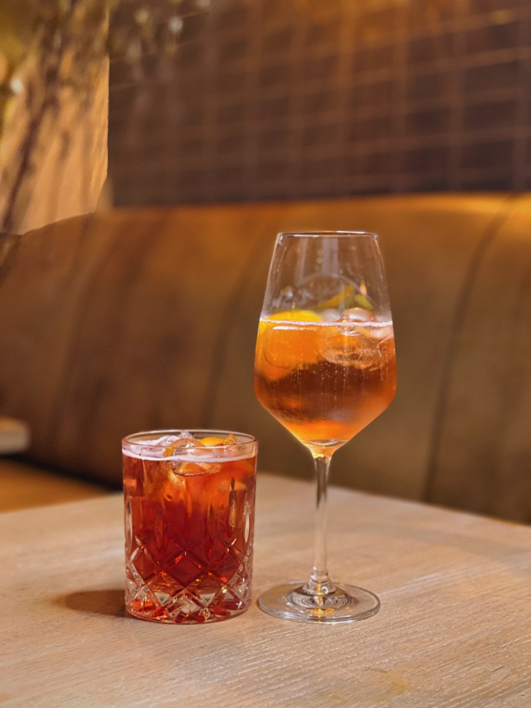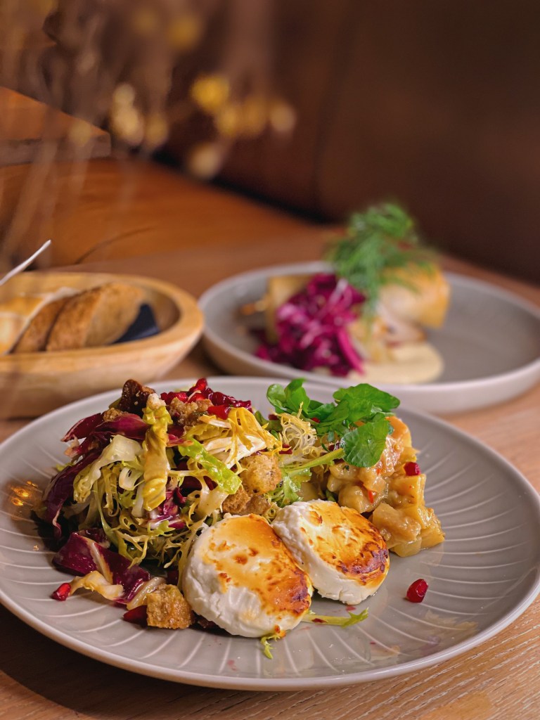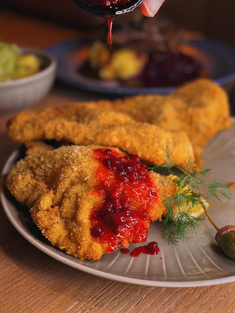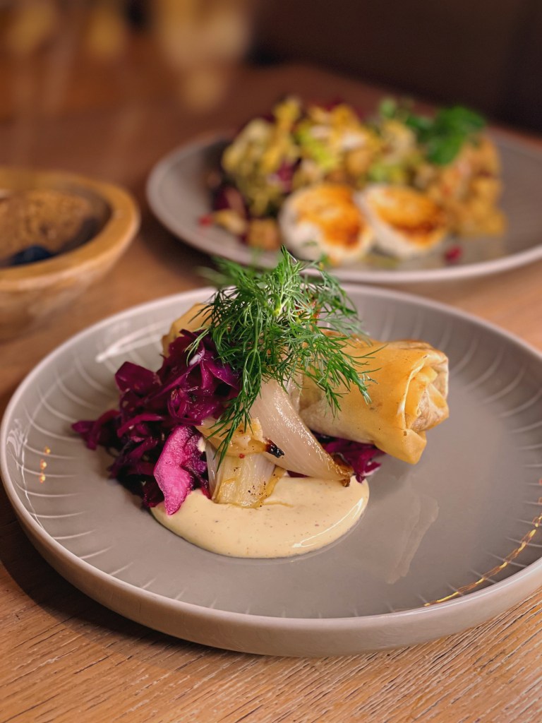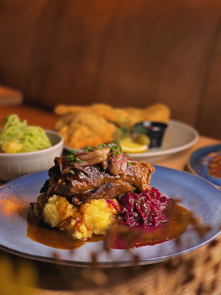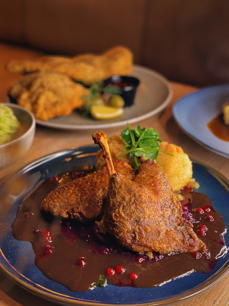 Unser Abend begann mit exquisiten Aperitifs: HELMUT X SCHUBACK mit Saliné, Helmut & Prosecco sowie BELSAZAR ROSÉ SPRITZ mit Cremant, Creme de Cassis & Belsazar, die den Abend perfekt einläuteten. Die Vorspeisen waren bereits ein köstlicher Vorgeschmack auf das, was noch kommen sollte: Ein erfrischender gemischter Salat mit Granatapfel, Rosmarincroutons und Quittenchutney, dazu gratinierter Ziegenkäse. Das Frittierte Winterröllchen mit Ente, begleitet von Rot- und Spitzkohlsalat sowie confierten Schalotten, war ein Fest für die Sinne. Die Hauptgänge verkörperten deutsche Kulinarik in Vollendung: Zarte Oldenburger Ente mit Rotkohl, Kartoffelklößen und einer herrlichen Jus. Die klassische Rinderroulade, begleitet von Rotkohl, Kartoffelstampf und ebenfalls mit Jus, war ein wahrer Hochgenuss. Das Wiener Schnitzel, serviert mit Kartoffel-Gurken-Salat und Preiselbeeren, rundete das Angebot ab und ließ das Herz höher schlagen. Zum grandiosen Abschluss gab es das Dessert: Schokomousse, frittierter Milchreis und Zwetschgenkompott, ein delikater Genuss, der uns mit einem Lächeln auf den Lippen zurückließ.
