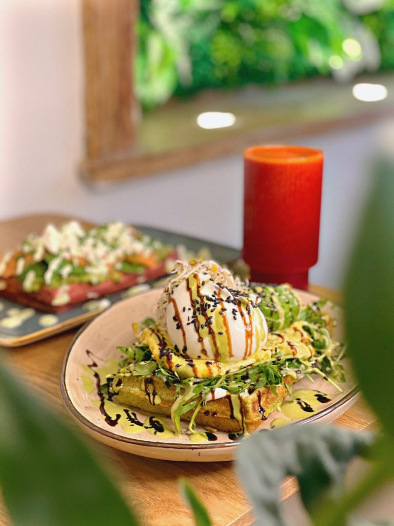 Unser Besuch begann mit einer Erfrischung aus frisch gepressten Säften. Ein Saft aus Rote Beete, Kurkuma und Orange und ein Spinat-Gurken-Apfel-Minze-Saft. Das Herzstück des Besuchs waren zweifellos die Waffelkreationen. Die Rote Beete-Waffel mit Avocado-Mash, zartem Babyspinat, feinem Räucherlachs, würzigem Feta, Gurken-Creme und Schnittlauch war eine köstliche Kombination aus herzhaft und erfrischend und die vegetarische Avocado Lover Spinat-Waffel erfreute uns mit Feta-Mousse, Rucola, Rührei, halber Avocado, zarter Burrata, Pesto-Creme, Balsamico-Creme, Sesam und Sprossen. Das Café selbst ist charmant eingerichtet – mit Obst in Kisten vor dem Tresen und gemütlichen Sesseln am Fenster, die zum Verweilen einladen.