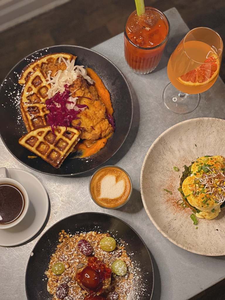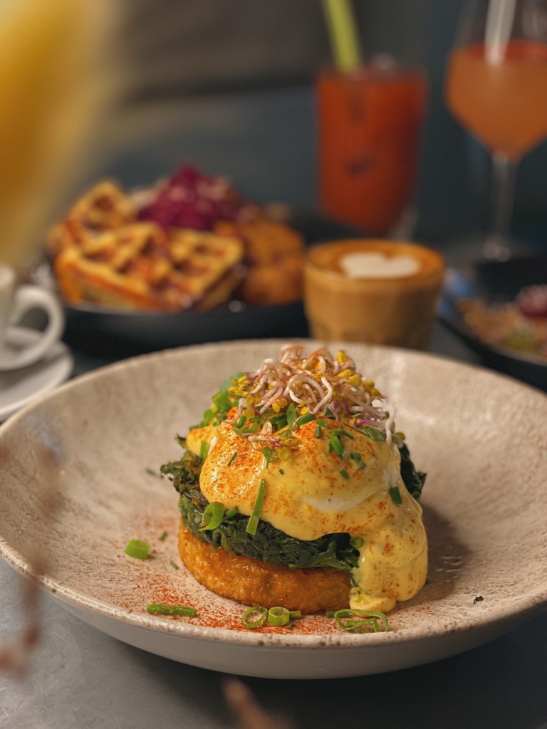 Das Highlight des Brunchs waren zweifelsohne die Eggs Richard: zwei perfekt pochierte Eier auf knusprigem Kartoffelrösti, saftigem Spinat, und gekrönt mit einer köstlichen Hollandaise. Für diejenigen mit einer Vorliebe für Süßes bietet sich der Franzbrötchenauflauf mit Zwetschgenröster und Vanillesauce an. Ein weiteres beliebtes Gericht, das Chicken n Waffles, besteht aus frittiertem Buttermilch-Huhn oder Blumenkohl, serviert auf einer belgischen Waffel, begleitet von cremigem Süßkartoffel-Püree, würzigen Chili-Pickles und natürlich Ahornsirup.