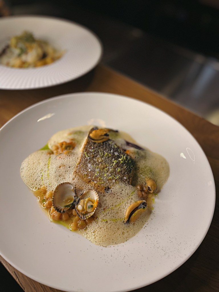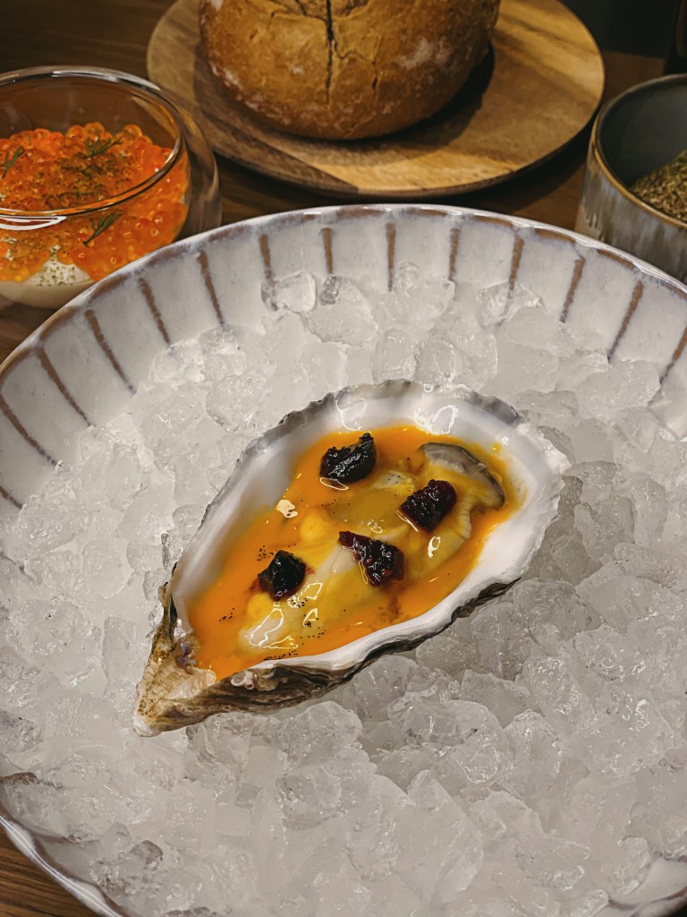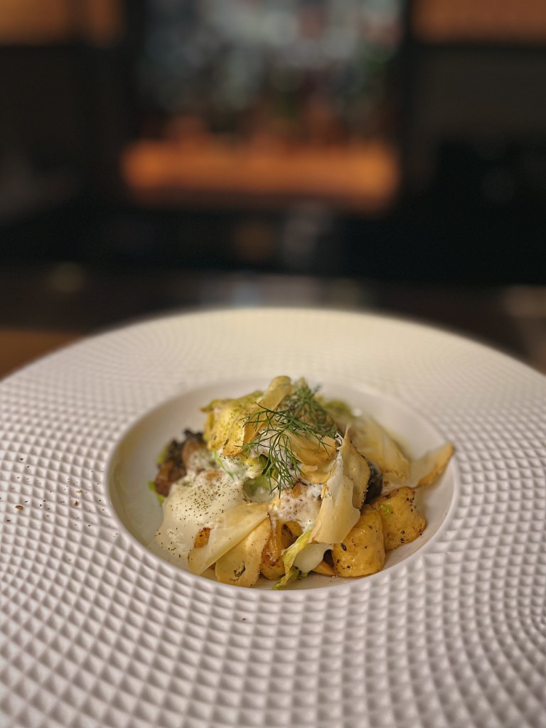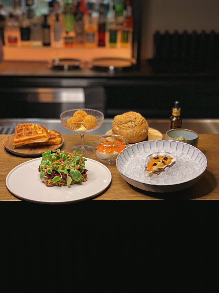 Wir nahmen an der gemütlichen Bar Platz und wurden von Head Bartender Moritz Schulte mit seinen außergewöhnlichen Eigenkreationen verzaubert. Der AUTUMN HARVEST, eine Mischung aus Rum, Apfelbutter, Wein-Aperitif, Pumpkin Spice, fermentierten Blaubeeren und Eiweiß, sowie der RAINY DAY mit Aquavit, Dill, Gurke, Rote Beete, Holunder und Bergamotte waren beide unfassbar gut. Das kulinarische Abenteuer begann mit sensationellem Barfood, darunter Austern und besonders beeindruckend die garnierte AUSTER Pléiade Poget No. 2. Das KOERNERBROT mit Karotten-Tatar, Speck und Feldsalat sowie die BACKHENDL PRALINEN mit Zitronenmayonnaise waren ebenso beeindruckend. Auch die KARTOFFEL WAFFEL mit Käse, Schmand, Forellenkaviar und das frische Brot mit Nussbutter waren ein Traum. Die Reise setzte sich fort mit der GESCHMORTEN SCHWEINEBACKE: Quitte, Marone, geräucherter Kartoffelschaum und der extrem guten ROTE BEETE ESSENZ mit Oscietra Kaviar, Schmand und Blini. Im Hauptgang beeindruckten der WOLFSBARSCH mit Muscheln und Chicorée Fregola di Sarda sowie die RICOTTA GNOCCHI mit Vacherin Mont d’Or und fermentierten Kohlsprossen. Als süße Verführung gab es MUTZEN MANDEL: süßes Gebäck, Eierlikör Crème, und als krönender Abschluss das Dessert MANDARINE: Mandel, Kaffee Crumble, Estragon.
