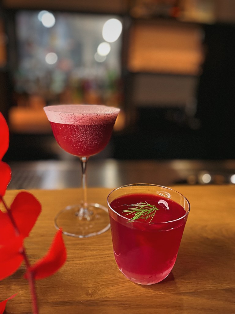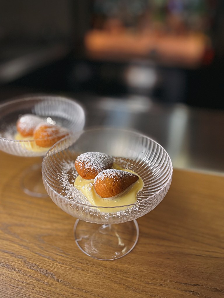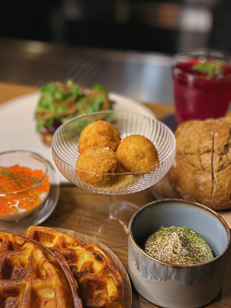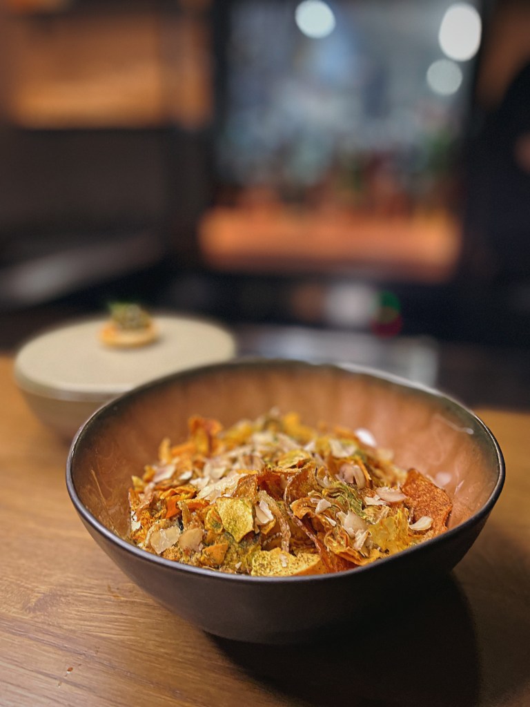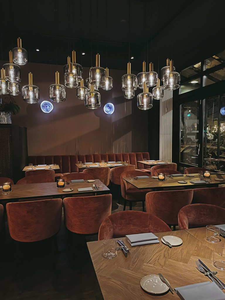 Wir nahmen an der gemütlichen Bar Platz und wurden von Head Bartender Moritz Schulte mit seinen außergewöhnlichen Eigenkreationen verzaubert. Der AUTUMN HARVEST, eine Mischung aus Rum, Apfelbutter, Wein-Aperitif, Pumpkin Spice, fermentierten Blaubeeren und Eiweiß, sowie der RAINY DAY mit Aquavit, Dill, Gurke, Rote Beete, Holunder und Bergamotte waren beide unfassbar gut. Das kulinarische Abenteuer begann mit sensationellem Barfood, darunter Austern und besonders beeindruckend die garnierte AUSTER Pléiade Poget No. 2. Das KOERNERBROT mit Karotten-Tatar, Speck und Feldsalat sowie die BACKHENDL PRALINEN mit Zitronenmayonnaise waren ebenso beeindruckend. Auch die KARTOFFEL WAFFEL mit Käse, Schmand, Forellenkaviar und das frische Brot mit Nussbutter waren ein Traum. Die Reise setzte sich fort mit der GESCHMORTEN SCHWEINEBACKE: Quitte, Marone, geräucherter Kartoffelschaum und der extrem guten ROTE BEETE ESSENZ mit Oscietra Kaviar, Schmand und Blini. Im Hauptgang beeindruckten der WOLFSBARSCH mit Muscheln und Chicorée Fregola di Sarda sowie die RICOTTA GNOCCHI mit Vacherin Mont d’Or und fermentierten Kohlsprossen. Als süße Verführung gab es MUTZEN MANDEL: süßes Gebäck, Eierlikör Crème, und als krönender Abschluss das Dessert MANDARINE: Mandel, Kaffee Crumble, Estragon.