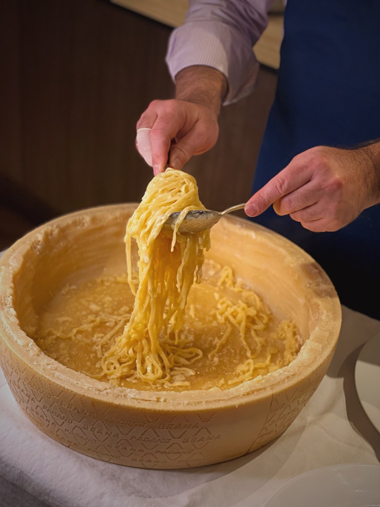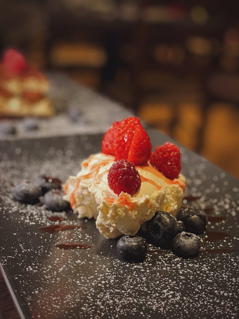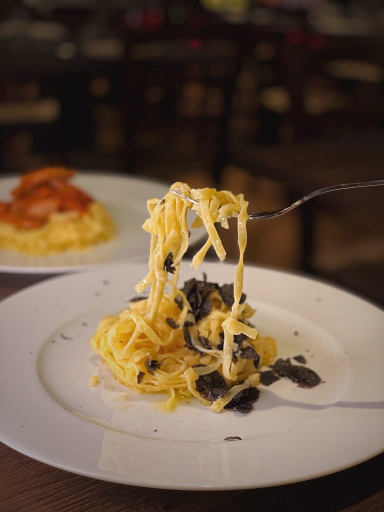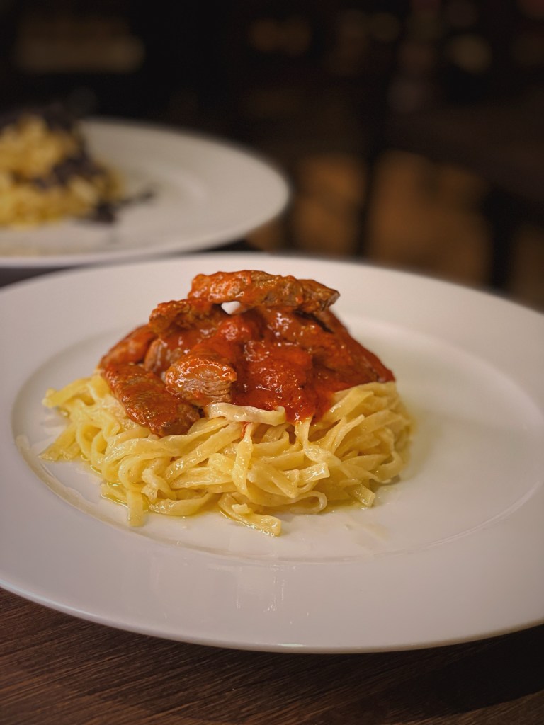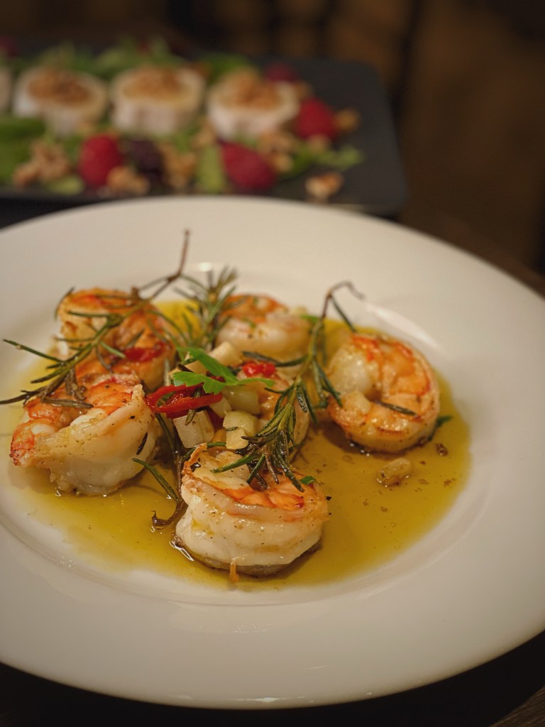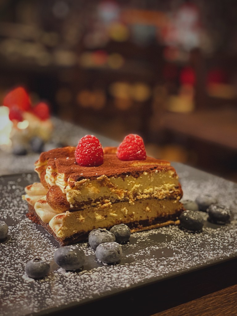 Wir starteten unseren Abend mit einem prickelnden Glas Champagner und gönnten uns Ziegenkäse mit Walnüssen und Honig sowie köstliche Gamberetti in Knoblauch und Öl als Vorspeisen. Die Hauptgänge, Frische Tagliolini mit Trüffel und Frische Tagliolini mit zarten Rinderfiletspitzen aus dem Parmesanlaib, überzeugten nicht nur durch die exzellente Auswahl der Zutaten, sondern auch durch die meisterhafte Zubereitung. Die kulinarische Reise fand ihren süßen Abschluss mit einem unwiderstehlichen Mascarpone-Dessert, begleitet von frischen Beeren, sowie dem hauseigenen Tiramisu.