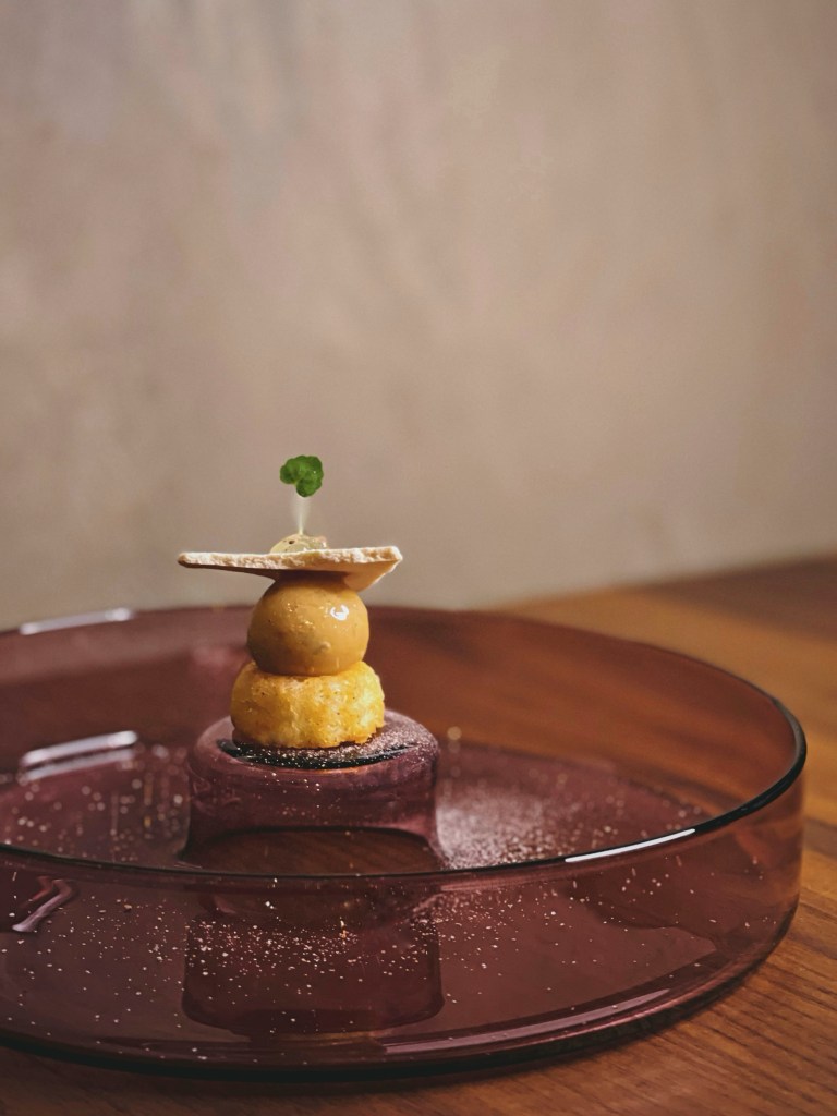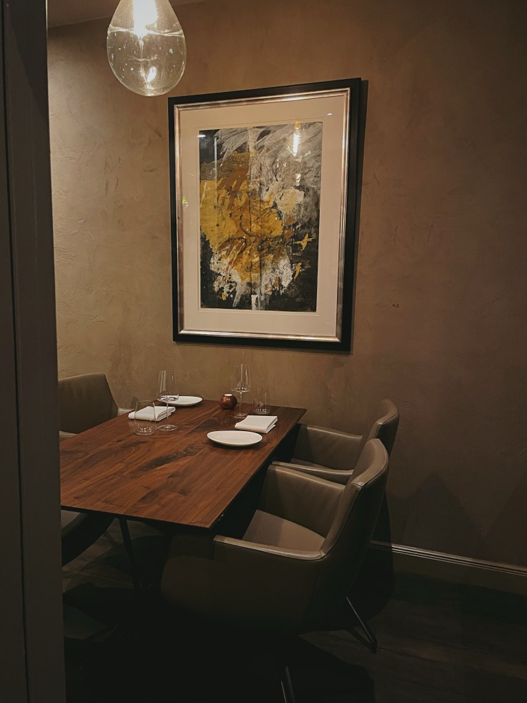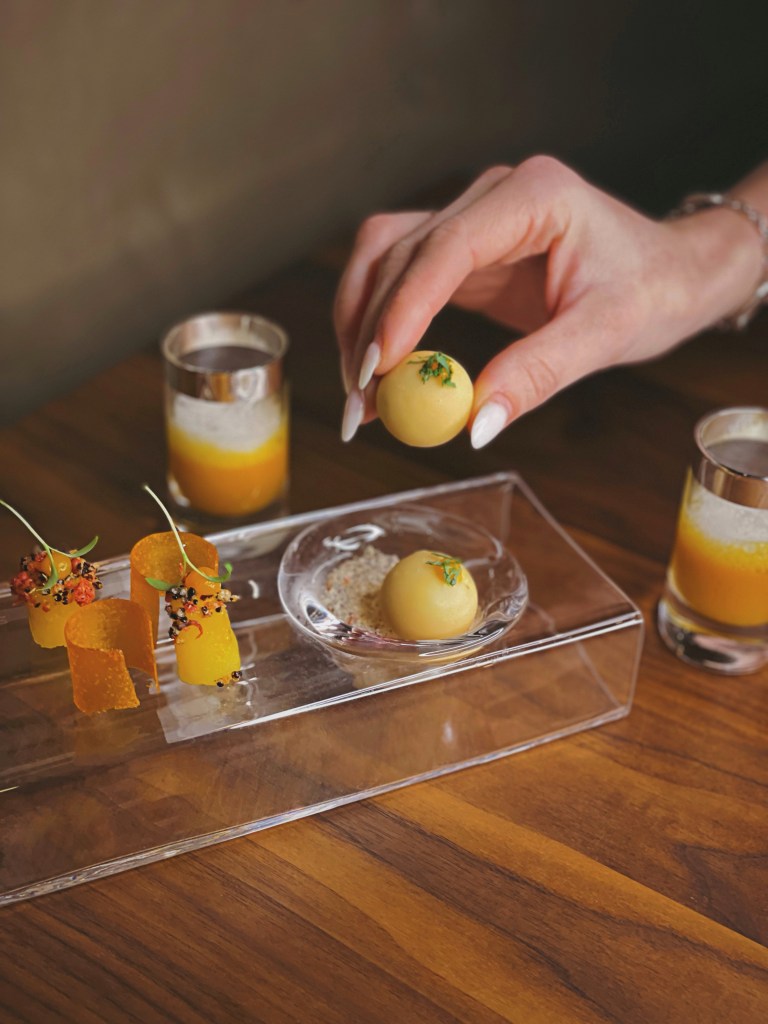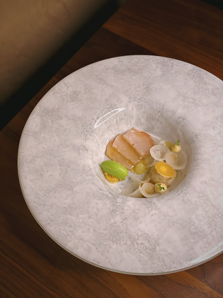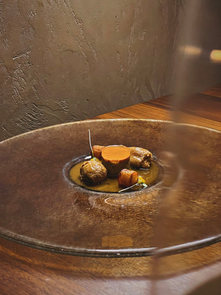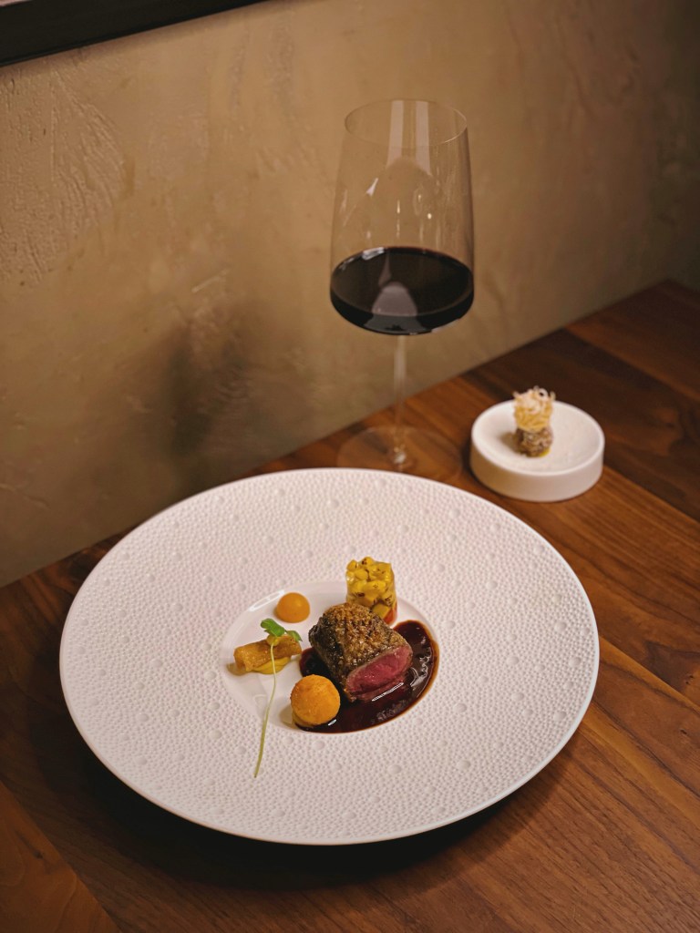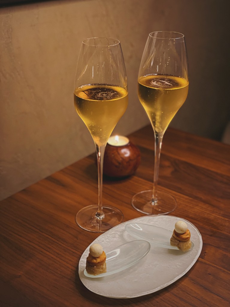 Unser Abend begann mit einem prickelnden Champagne Bouché Cuvée Réservée Brut, der unsere Sinne auf das kommende Festmahl einstimmte. Als Auftakt serviert uns das Team einen köstlichen Gruß aus der Küche: Flammkuchen von der geschmorten Tamara-Zwiebel – ein wahrer Gaumenschmaus! Das Menü entfaltete sich weiter mit kreativen und raffinierten Gerichten, die jede Erwartung übertrafen. Von der Karotte mit Gaspacho und Gelber-Karotte-Praline bis hin zum Hamachi mit Kohlrabi, Ingwer und Granny Smith – jedes Gericht war eine meisterhafte Komposition aus Aromen und Texturen. Besonders beeindruckend war die Marokkanische Gemüse Tarte mit Safran, Aubergine und Salzzitrone, gefolgt von einem delikaten Skrei mit Sushi Reis und Champagner Kraut. Die Tajine von der Poularde mit Kardonen und Smen Velouté sowie der Rehrücken mit Feigen, Rotkohl und Sellerie sorgten für wahre Geschmacksexplosionen. Das Dessert, ein Delice von der Schokolade mit Kaffee Ganache und Muskatblüteneis, sowie die abschließende Madeleine mit Schmand Praline rundeten das unvergessliche Erlebnis perfekt ab.
