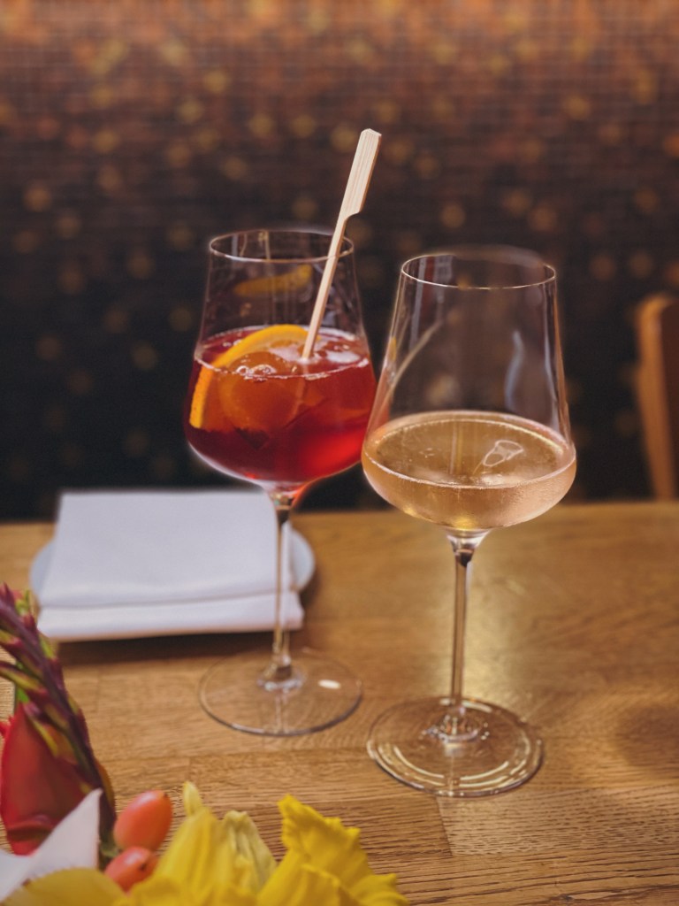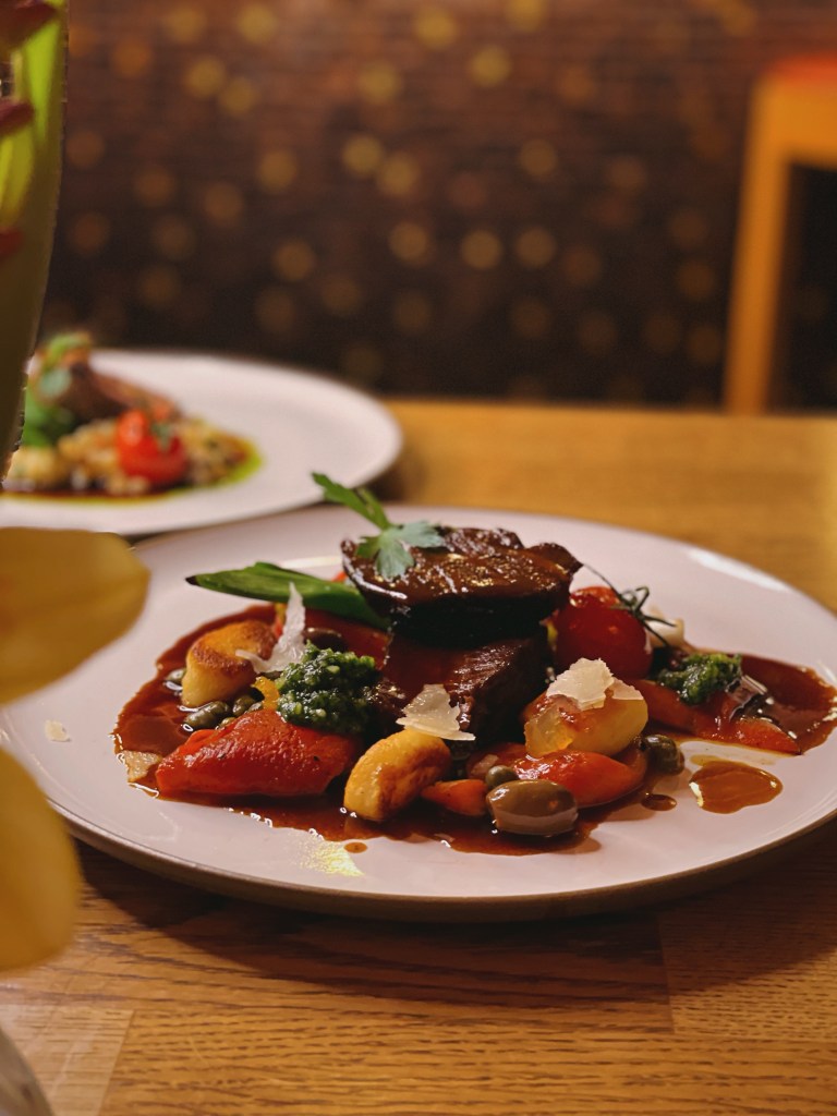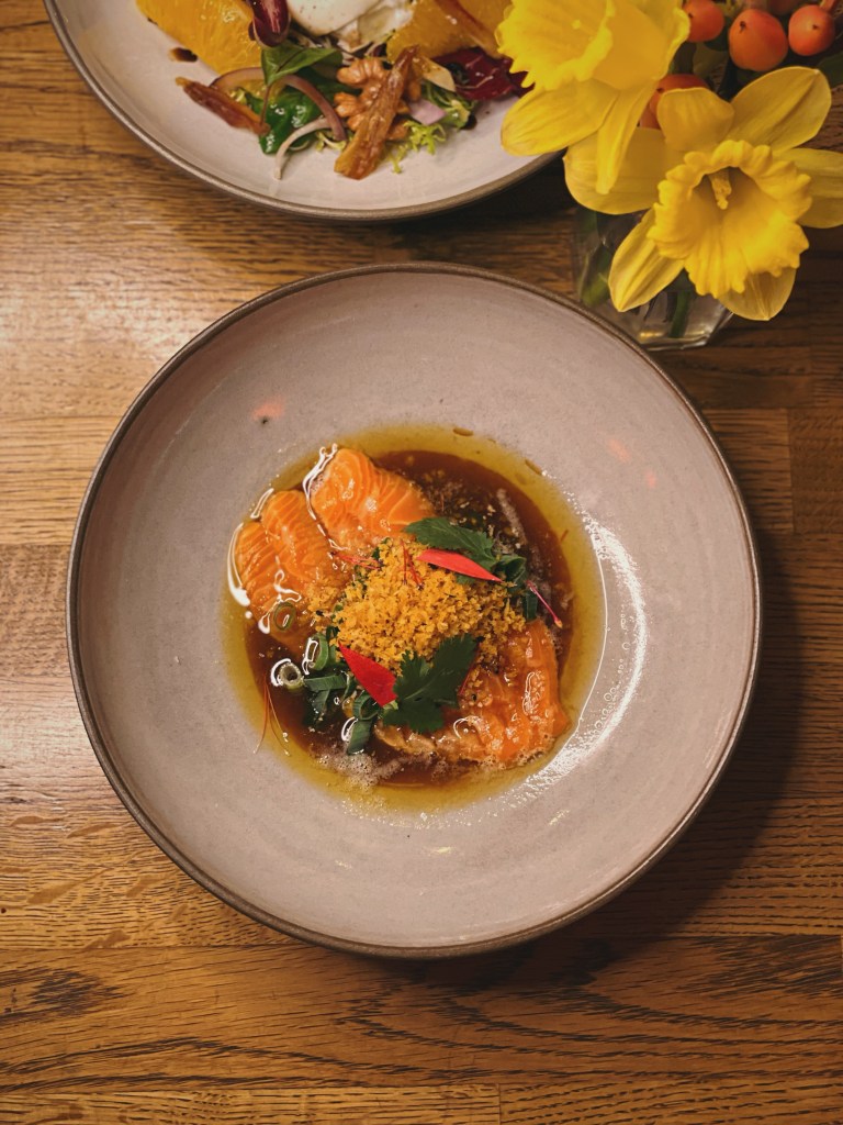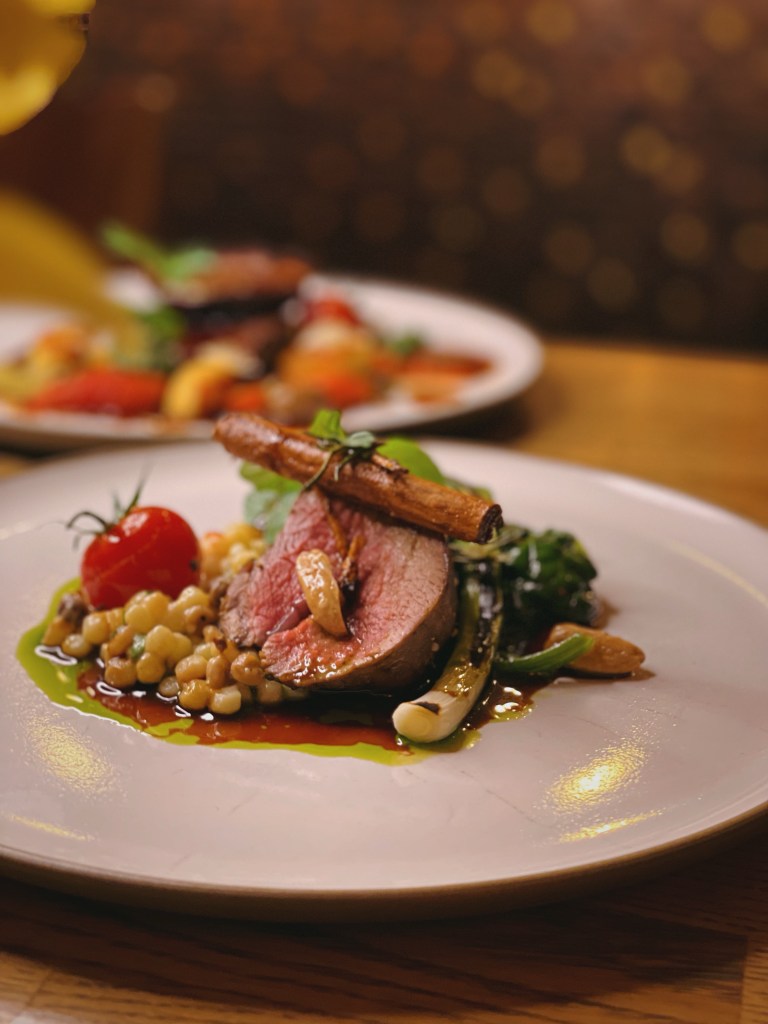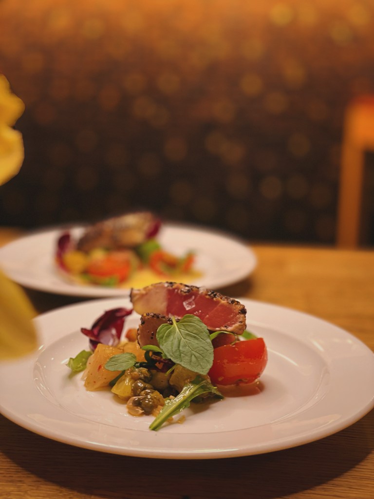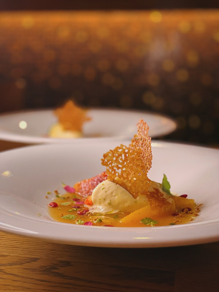 Mit einem Mondino Sprizz und einem erfrischenden Crémant rosé brut begannen wir unseren Abend. Der Bluefin Tuna überraschte uns mit einer delikaten Kombination aus Kaffee, Chili und Zitrusfruchtsalat, und auch das Sashimi von der Fjordforelle mit brauner Butter und Togarashi-Pfeffer tat es uns sehr an. Die Burrata auf einem Radicchio-Orangensalat war eine wahre Geschmacksexplosion mit Walnüssen, Datteln und altem Balsamico. Die Auswahl ließ keine Wünsche offen. Vom kross gebratenen Flussbarschfilet mit Sesambutter bis hin zum zarten Skrei mit Miesmuscheln und Jaipur Curry – jedes Gericht war ein Kunstwerk für sich. Besonders beeindruckten uns die Hauptgerichte. Die geschmorte Rinderbacke mit Petersilienpesto und Parmesangnocchi sowie die rosa gebratene Lammhüfte mit Raz al Hanout und cremiger Fregola Sarda. Doch das Highlight des Abends war zweifellos das Dessert – die soupe froide à l’orange. Mit Orangenfilets, weißem Schokoladeneis, Granatapfelkernen, Pistazien und einer knusprigen Orangenhippe verzauberte es unsere Sinne und hinterließ einen unvergesslichen Eindruck.