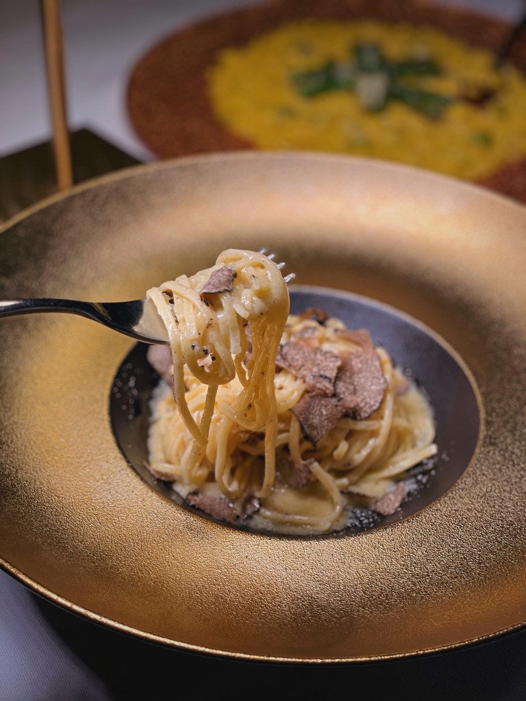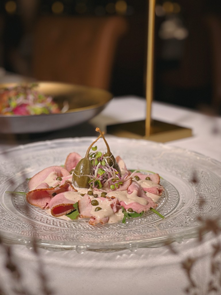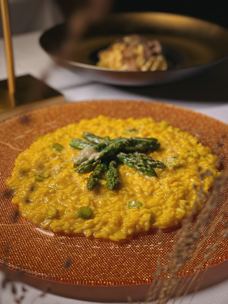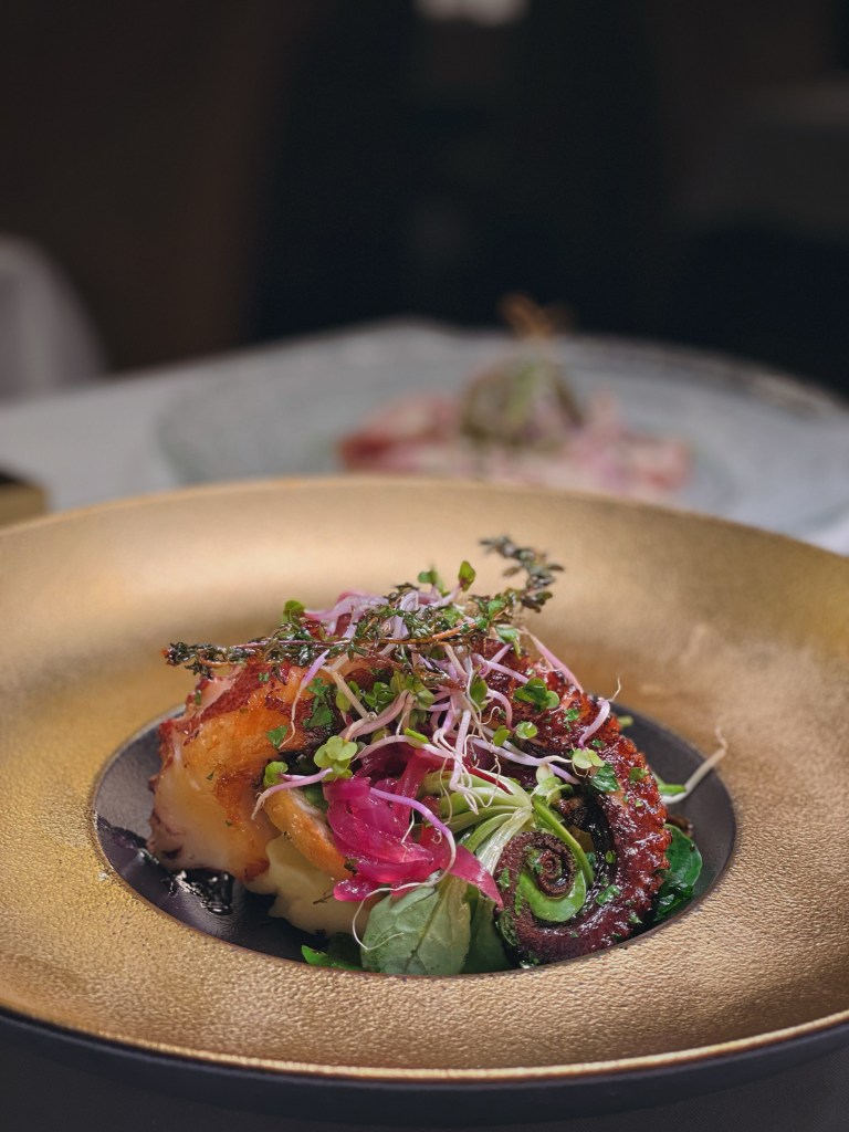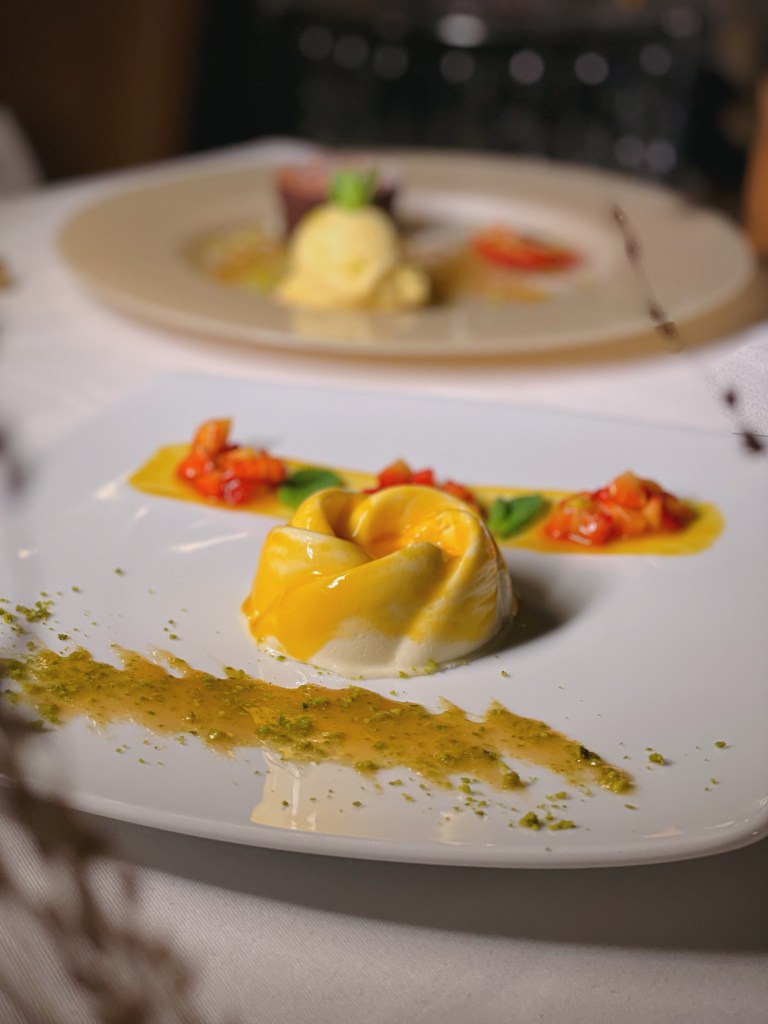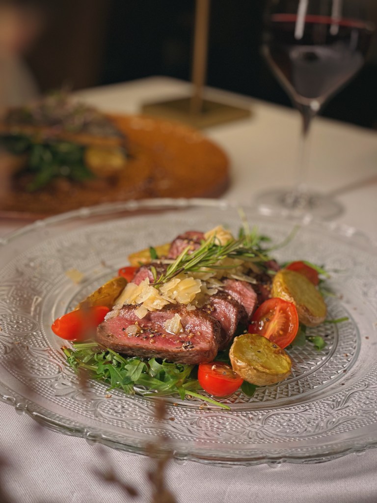Unser Abend begann mit zwei außergewöhnlichen Cocktails: einem Maracuja 43, der mit Likör 43, Maracujasaft, Limette und Angostura Bitter eine erfrischende Note traf, und einem Lavendel Tonic, bestehend aus Lava Belle, Tonic und Rosmarin. Als Gruß aus der Küche wurden uns Pilze mit Rosmarin und einem frischen Salat serviert, begleitet von knusprigem Brot und apulischem Olivenöl – eine schlichte, aber köstliche Einstimmung auf das, was noch folgen sollte. Unsere Vorspeisen waren ebenso beeindruckend: Das Il nostro Vitello Tonnato Capperi in Fiore bestand aus dünnen Kalbsfleischscheiben, die mit einer passierten Thunfischcreme und Apfelkapern garniert waren. Ebenso bemerkenswert war der Polipo crocante, ein knuspriger Oktopus auf Kartoffelstampf mit süßsauren Zwiebeln – selten haben wir einen so perfekt zubereiteten Pulpo gegessen! Weiter ging es mit hausgemachten Tagliolini, verfeinert mit frischem schwarzen Trüffel und Parmesan. Ein wahrer Genuss für Liebhaber italienischer Pasta. Der Hauptgang bot eine Vielfalt an exquisiten Gerichten: Das Risotto del Giorno, ein Safranrisotto mit grünem Spargel, überzeugte durch seine cremige Konsistenz und den intensiven Geschmack und das zarte Rindfleisch auf einem Rucola-Bett mit glasierten Kirschtomaten und einer Balsamico-Reduktion überzeugte uns auf ganzer Linie. Zum Abschluss verwöhnten uns die Desserts: Eine samtige Panna Cotta mit Mangocreme und Pistazienkaramell sowie das Tortino al Cioccolato di Modica di 70%, ein hausgemachtes Schokoladentörtchen aus 70% Bitterschokolade aus Modica (Sizilien) mit flüssigem Schokoladenherz, serviert mit einer Kugel Vanille-Eis.
